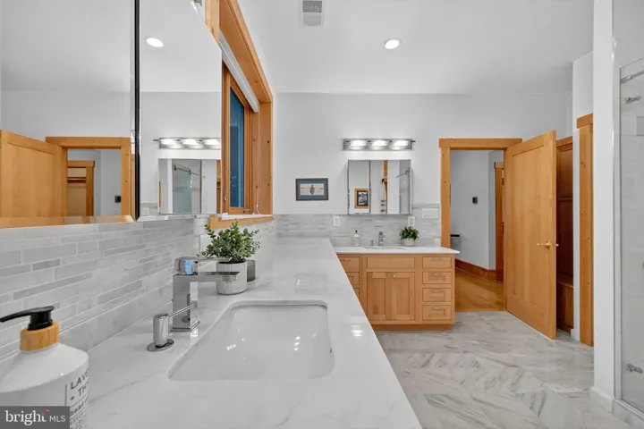 Every element of this home has been thoughtfully designed to optimize comfort and efficiency. From heated stone floors and custom window treatments, to flexible closet configurations that maximize storage options, no detail has been overlooked. Upstairs, an expansive master suite enjoys a private, screened balcony and a stunning marble bathroom with separate shower, soaking tub, and wrap-around dual vanity. En suite bathrooms in three of the four other generously-sized bedrooms ensure that this home can grow with your family and offer plenty of options for guests. The large, fully-finished basement includes a 2-car drive-in garage, mudroom, workshop, and additional storage areas perfect for an exercise room and wine cellar.