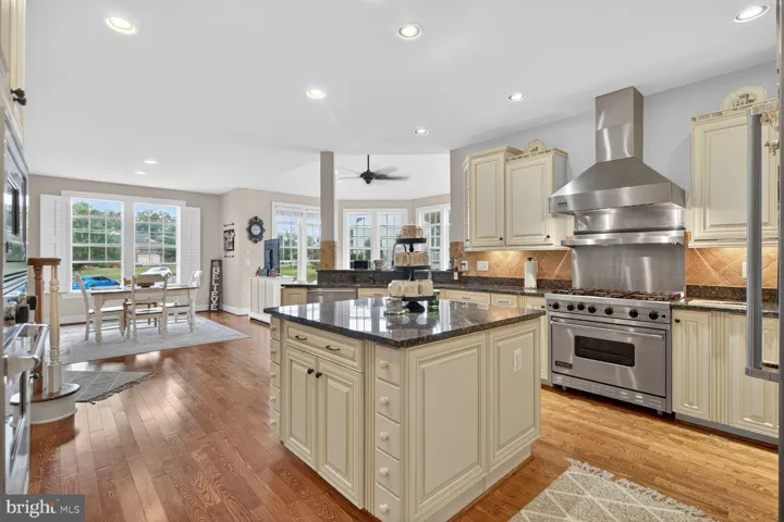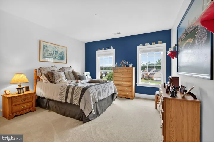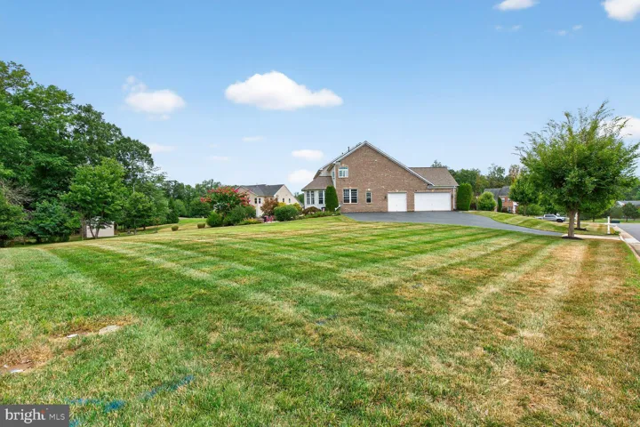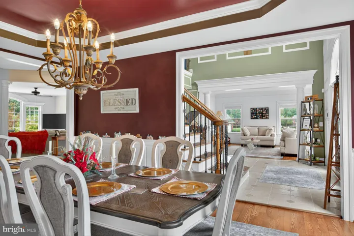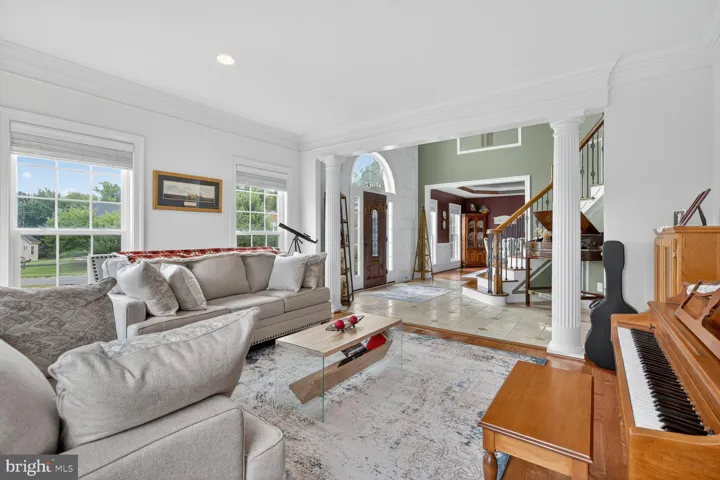 Grand, majestic, colonial with brick on three sides. Knightsbridge model built by NV Homes. Two-story foyer features Palladian windows, premium select French pattern noche tumbled travertine pavers flooring, and oak curved staircase. Living room boasts hardwood flooring, crown molding, 1/4 round shoe molding, and recessed lighting. Large formal dining room with tray ceiling, hardwood flooring, and wainscoting. Family room with gas fireplace, Palladian window with view of trees. Main-level office with wood and glass French doors, crown molding, recessed lighting, and floor to ceiling custom built-in stained wood book shelving with cabinet. Main level half-bath/powder room. Gourmet kitchen with hardwood flooring, 6-burner gas stove with oven, wall oven, built-in microwave, kitchen island, breakfast bar, granite countertops, top-of-the-line stainless Viking appliances. Both ovens are convection or standard usage. Eat-in breakfast area. Pantry. Sunroom with octagonal ceiling and hardwood flooring. Primary bedroom suite with tray ceiling and sitting area, two walk-in closets, luxury primary bath with tray ceiling, Jacuzzi, and walk-in double shower with seating. Jack & Jill full bath serves two additional bedrooms, and private full bath serves fourth bedroom. Lower level (basement) is fully finished except for a small part of the utility room. Lower level also features a large theater and exercise room, as well as a kitchen with sink, dishwasher, refrigerator and cabinet. Lower level also features a den which can be easily converted to a 5th bedroom by adding a closet. The den has a full Jack & Jill bathroom to serve the lower level. Parking driveway space outside the 3-car garage is utterly massive as is the multi-level patio with fire pit.
