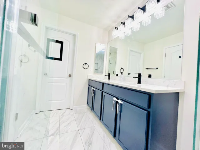 The upper level includes a luxurious owner’s suite with tray ceiling, two Walk-in customized closets in owners suits, and a stunning en-suite bath with premium floor-to-ceiling tile, quartz counters, dual sinks, and oversized shower. Two additional bedrooms share a full bath with dual sinks and separate toilet/tub area. Upper-level laundry for convenience.