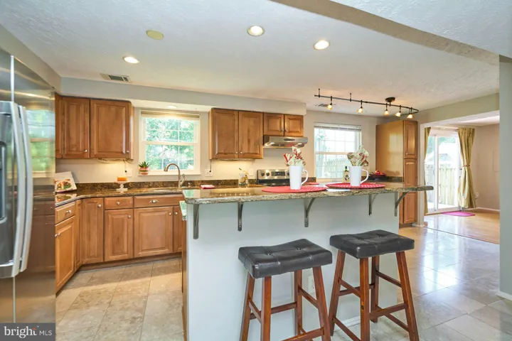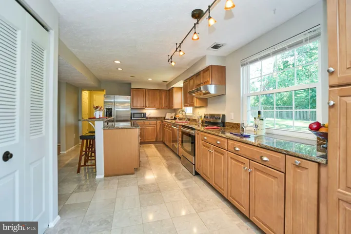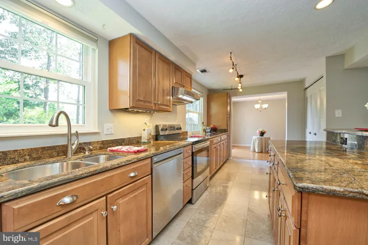 The remodeled kitchen shines with granite countertops, an island, and stainless steel appliances. A convenient mudroom with front-load washer and dryer connects to the garage.