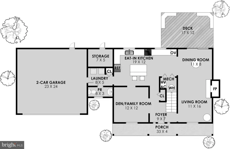 Step into this beautifully maintained home featuring hardwood floors throughout the main level and ceramic tile in the foyer, hall, kitchen, laundry, and powder room. The spacious living/dining room offers a cozy wood-burning fireplace, while a separate den off the kitchen provides flexible space for work or relaxation.