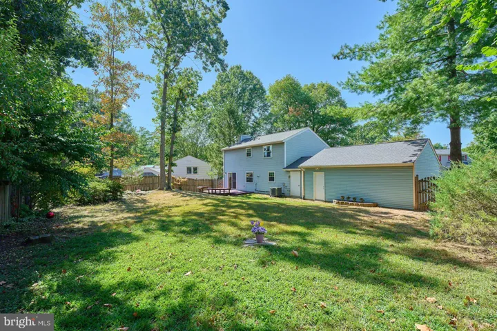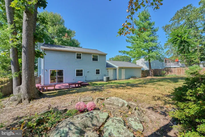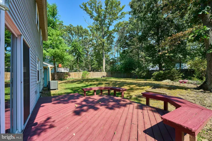Enjoy outdoor living with a sliding glass door opening to a large fenced yard and deck with built-in bench seating.