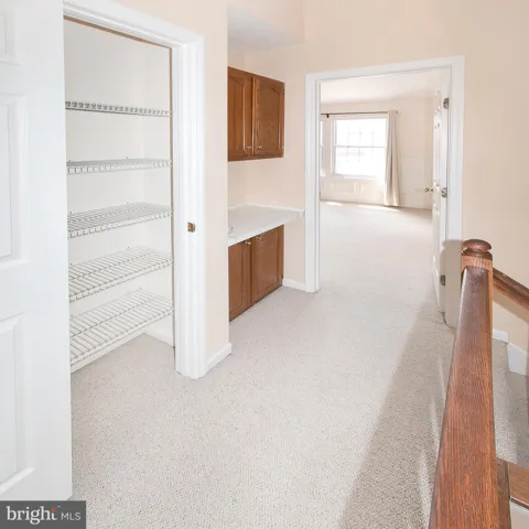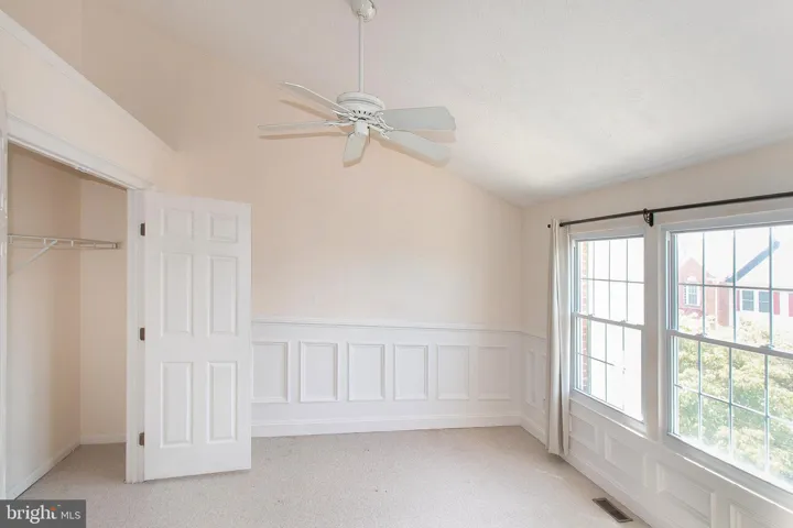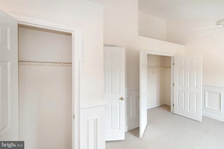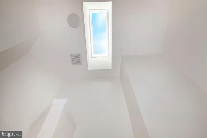 The upper level offers three bedrooms and two full baths, all with vaulted or cathedral ceilings. Two skylights brighten the hallway and hallway bath, while a built-in counter with cabinets and a linen closet which adds as storage in the hallway. The spacious primary suite features two closets, huge double windows, a shadow box details, and a laundry chute.