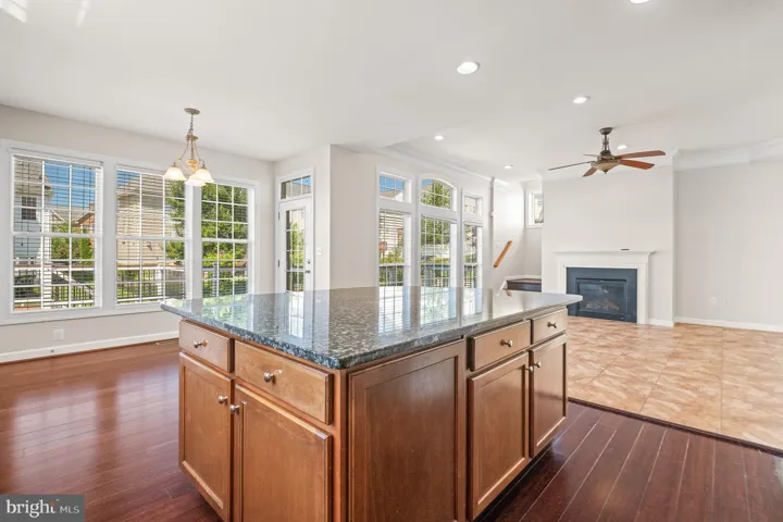The main level features open living spaces with bamboo hardwood flooring, ceramic tile, a formal dining room, and a spacious family room with gas fireplace. The gourmet kitchen boasts an oversized island, double ovens, and abundant cabinetry, flowing to the large deck and fenced backyard.