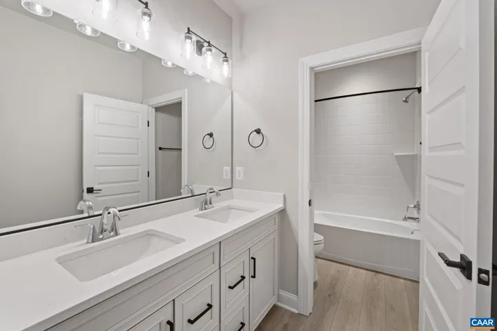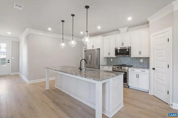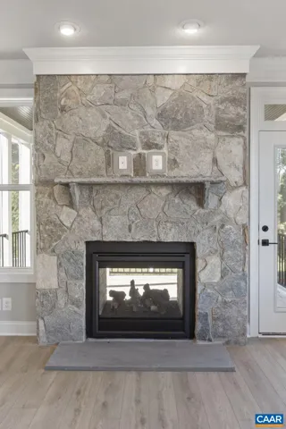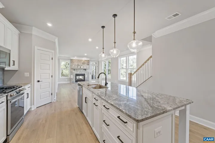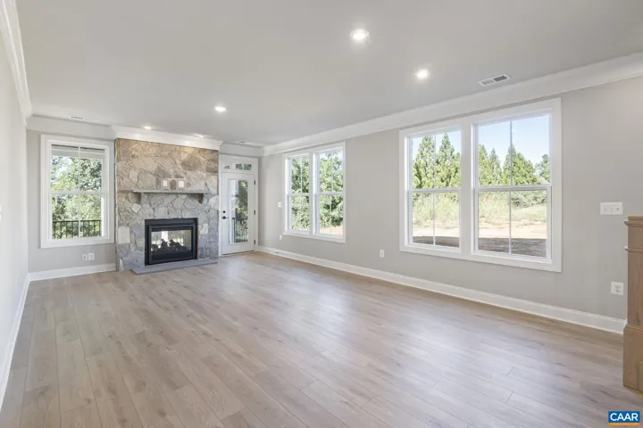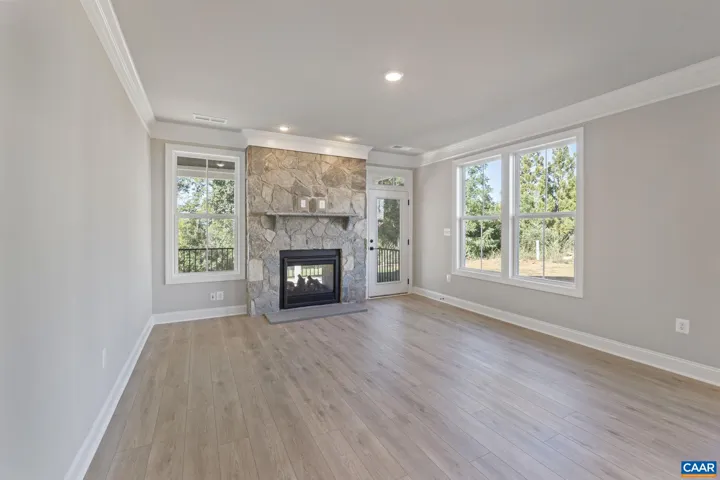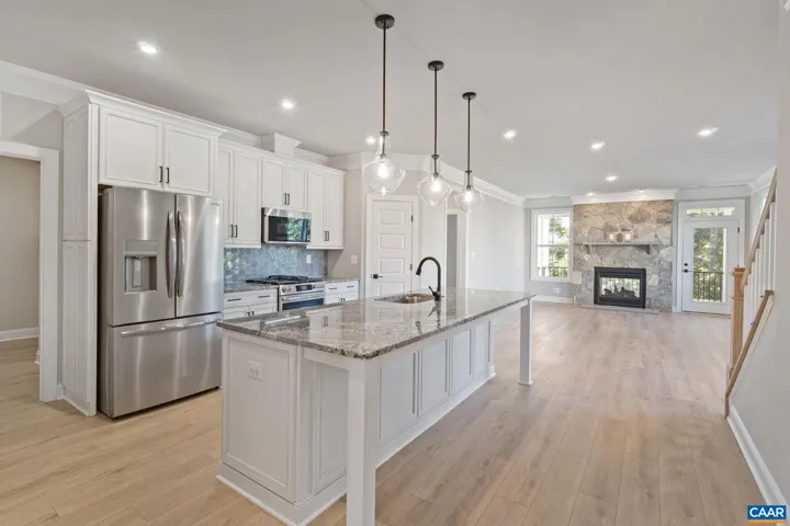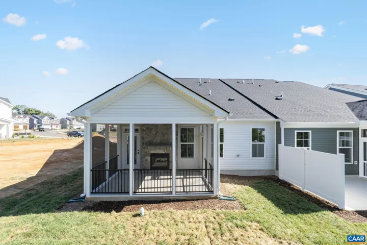 Just completed – the Bayberry in Creekwood Village offers a main-level living layout with additional upstairs space for added flexibility. The primary suite is conveniently located on the first floor, along with a spacious living area that connects to a screened porch featuring an indoor/outdoor stone fireplace?ideal for year-round use. This villa includes a metal roof accent, oak stairs with wooden railing, and a two-car garage. Upstairs, you’ll find two additional bedrooms, a hall bath, a loft, a pocket office, and dedicated storage. Actual photos!,Quartz Counter,White Cabinets,Fireplace in Family Room