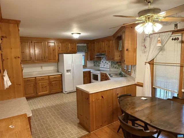 Paradise Found: Lovely brick 2 bedroom home with large eat in kitchen, pasture between home & road, storage building, 42’x30′ shop/barn, woods & more! Bring your horses, cattle, chickens and make this your homestead! Firefly fiber internet to pole. Located near I-64 w/ easy access to Richmond or Charlottesville on 34+ acres of pasture & woods. You must see the lovely wood floors, great floor plan, pasture and woods to appreciate all this country home offers. Currently in land use for lower real estate taxes! Tired of city living? Here’s your chance to escape to the country!,White Cabinets,Fireplace in Living Room