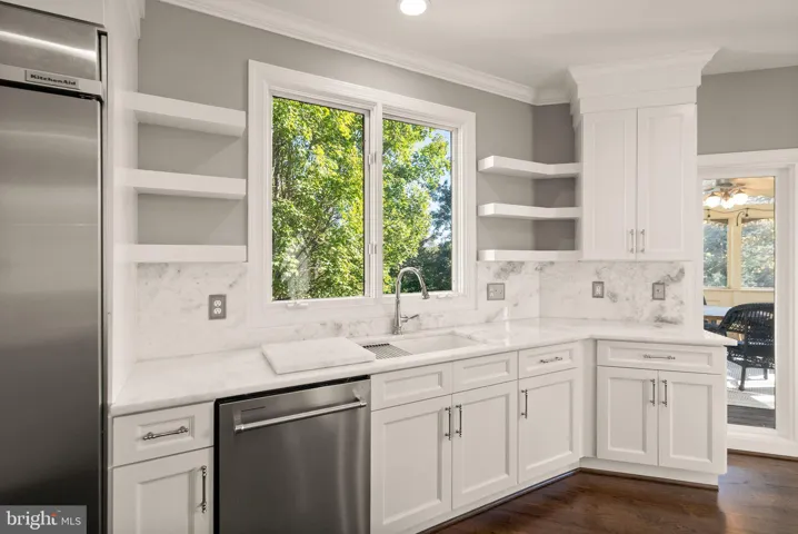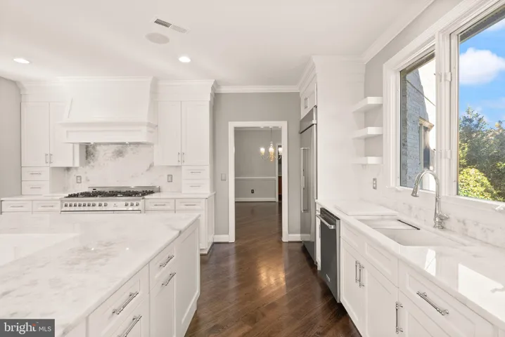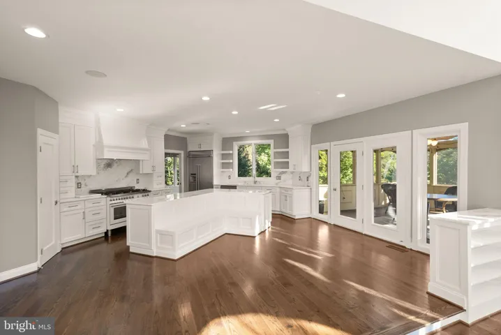 The completely redesigned chef’s kitchen is a showstopper, showcasing custom soft-close cabinetry, marble countertops, built-in KitchenAid refrigerator, microwave drawer, Italian 48” range, and custom vent hood. The kitchen flows seamlessly to a screened porch and deck overlooking the golf course—perfect for dining al fresco.