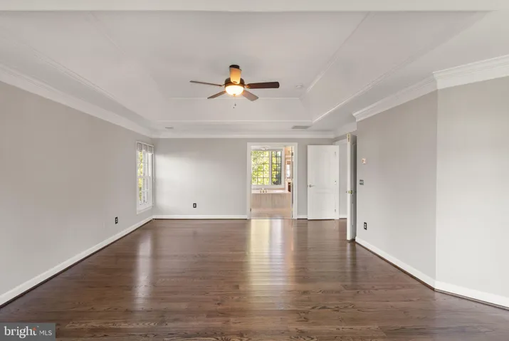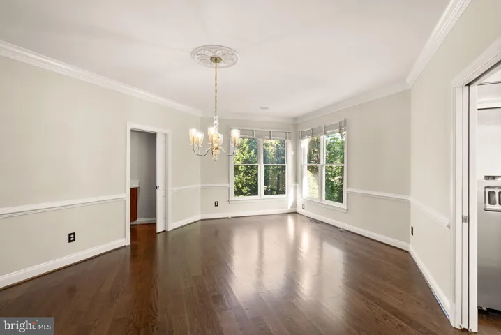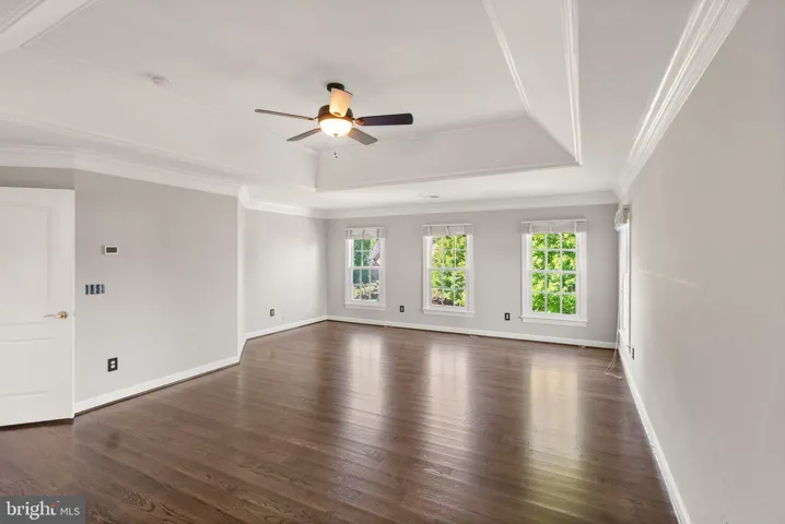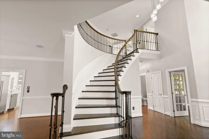 Inside, the grand two-story foyer with a dramatic curved staircase sets the stage for the refined interior. The main level features new 5” wood flooring throughout, extending to the stairs, owner’s suite, and upper hallway. Formal living and dining rooms provide generous entertaining space, with the living room enhanced by a coffered ceiling and custom floor-to-ceiling molding. A private study with built-ins adds functionality, while the two-story family room with a gas fireplace and rear staircase creates a warm central gathering place.