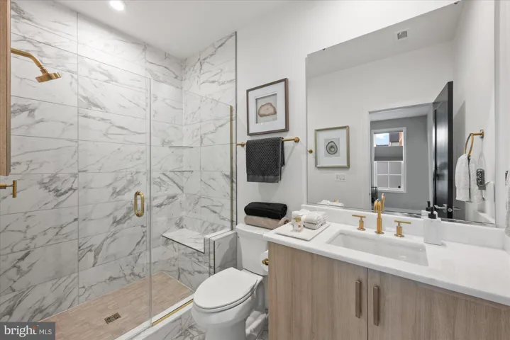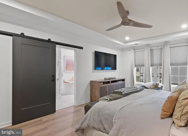 The bedroom level is a sanctuary of serenity and hosts 9-foot ceilings. The primary suite impresses with a tray ceiling, recessed lighting, and an upscale ceiling fan, complemented by a wall of windows adorned with custom blackout shades. A custom walk-in closet with built-in storage provides organization, while the spa-inspired bath offers indulgence: a soaking tub, white cabinetry with gold fixtures, an expansive walk-in shower with rain head and multiple sprayers, and seamless glass surround. Two additional bedrooms, each with custom closets, share a stylish full bath. A well-appointed laundry room with full-size appliances and optimized storage completes the level.