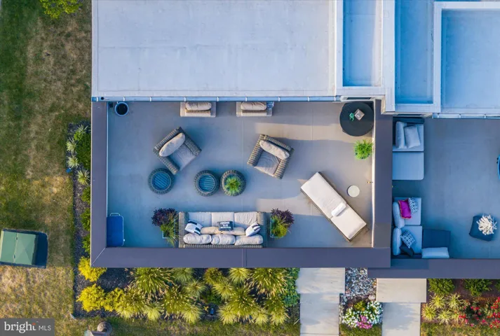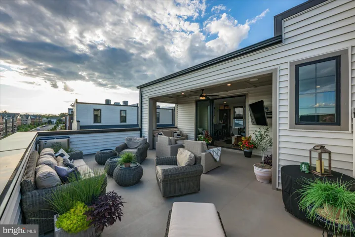 The upper level is designed for both recreation and leisure with 9 foot ceilings. A sunlit lounge, enhanced with a sliding pocket door and protective tinting, features a built-in bar with beverage refrigerator, sink, and storage, as well as an additional powder room for convenience. Stepping out onto the impressive 800-square-foot roof terrace is nothing short of breathtaking offering both covered and open-air spaces perfect for entertaining, dining, or simply savoring panoramic views and unforgettable sunsets.
