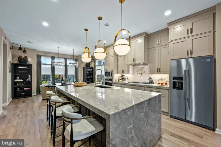Ascending to the main level, this level showcases 10-foot ceilings and truly dazzles with designer finishes. High-end chandeliers, elegant cabinetry, and intricate trim work create a striking backdrop, while the expansive quartzite waterfall island serves as the heart of the kitchen. A custom cooktop hood, pot filler, and an Elfa-organized pantry underscore the thoughtful craftsmanship. The dining room, illuminated by dual chandeliers and dramatic sconces, is bathed in natural light from oversized windows. Flowing seamlessly into the great room, a wall of windows opens onto the deck, offering an ideal space for both casual gatherings and refined entertaining. A striking powder room featuring oversized floor to ceiling tile and luxury fixtures adds to the allure.