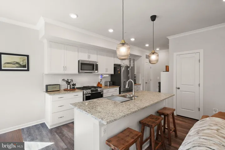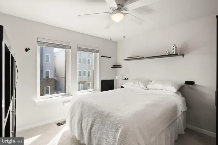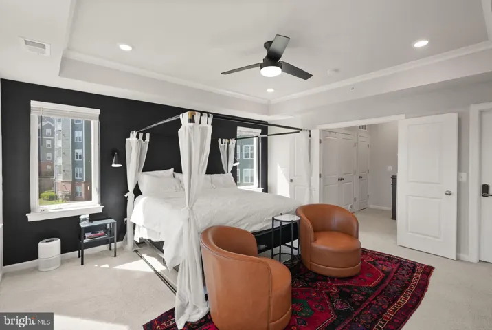 Upstairs, you’ll find two spacious bedrooms served by a well-appointed hall bath. Continue to the top floor for a private retreat: a sprawling primary suite with tray ceiling, large walk-in closet, and an en-suite bath featuring a walk-in shower and a double-sink vanity topped with upgraded quartz. Laundry is smartly located on the same level as the primary suite.