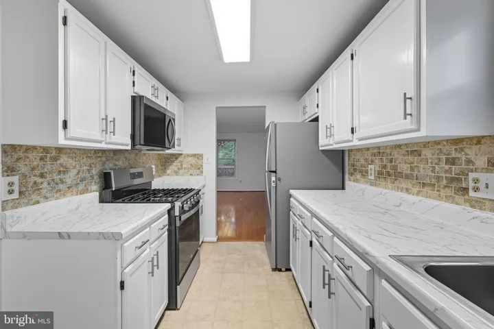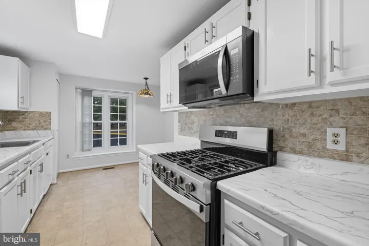 The main level features gleaming hardwood floors, expansive windows, and a clean, modern kitchen with white cabinetry, marble-style countertops, warm-toned backsplash, a BRAND-NEW STOVE, and a BRAND-NEW BUILT-IN MICROWAVE. The generously sized living area flows seamlessly to a large wraparound deck overlooking mature trees, ideal for relaxing evenings or weekend gatherings.