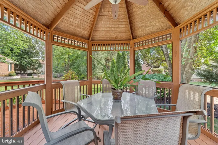 The main level is designed for living and entertaining with hardwood floors, a bright open layout, and a gourmet island kitchen featuring granite counters and a cooktop. The family room centers around a fireplace, the formal dining room is perfect for gatherings, and the private library with built-ins makes an ideal home office. French doors open to a spacious deck with a gazebo, creating a seamless indoor-outdoor flow.