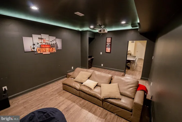 Downstairs is a destination: a completely finished, walk-out basement with daylight windows, recessed lights, lit stair treads, fresh paint, and laminated wood flooring. Enjoy a spacious entertainment area with wet bar, a dedicated movie theater (surround sound with in-ceiling speakers, projection screen + projector), a gym, multipurpose room, an added bedroom, and a full bathroom—flexible spaces for work, play, and guests. Upper-level bedrooms feature new carpet.