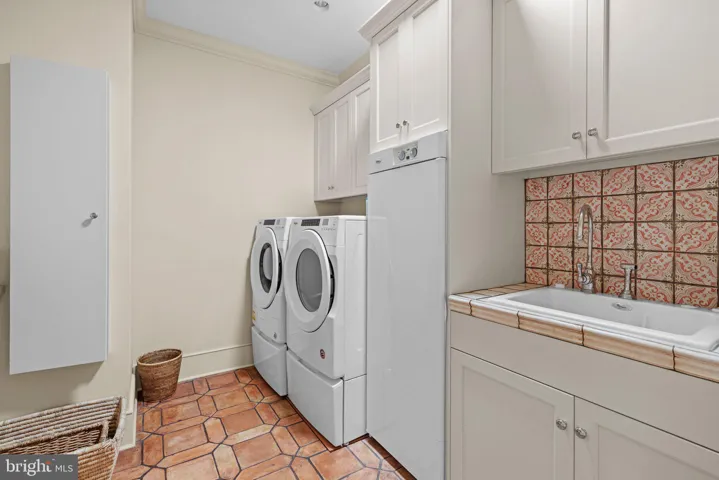 The elegant William Ohs Kitchen, with its superior craftsmanship, is the epitome of a truly beautiful chef’s kitchen. The custom cabinetry is graced with Carrara marble countertops and backsplash and Waterworks fixtures. The appliances include Wolf, Sub-Zero and Miele, and a large pantry offers additional storage. At one end of the kitchen a spacious breakfast area opens out to a charming brick terrace with pergola.