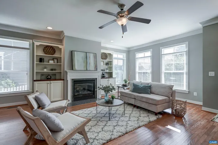 Charming, Old Trail craftsman style home that is walkable to downtown Crozet! Bright, open floor plan with high ceilings, fresh paint, and gorgeous hardwood floors. Open main level features a large living room with gas fireplace surrounded by custom built-ins. Gourmet kitchen is a home chef?s dream, with expansive granite surfaces, ample white cabinetry, reverse osmosis water filter, built-in beverage cooler, tile backsplash and breakfast bar. The dining area is just perfect, natural light pours in from 2 sides, including the french doors that lead to the screened porch. Completely updated screened porch with string lighting overlooks large paver patio with built-in firepit, and fenced yard with off-street parking. Upstairs you will find a spacious master suite with multiple closets, including a walk-in, and a well-appointed master bath with frameless glass shower. 2 additional bedrooms and a full bath complete the upper level. Conditioned crawl space, storage shed, and floored attic provide extra storage.,Granite Counter,White Cabinets,Fireplace in Great Room
