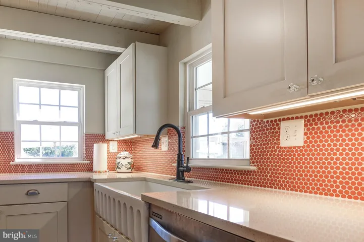 A classic farmhouse front porch extends across the front of the home, offering a welcoming and authentic farmhouse entry. Inside, the original farmhouse features a living room with exposed beams overhead and heart pine floors showcase the surprisingly scaled dining room that comfortably seats 12. The gourmet kitchen is designed for the serious cook with a six-burner dual-fuel range, a large quartz island with seating for five, a farmhouse sink, round mosaic backsplash, and generous cabinetry. A nearby cozy sunroom is the perfect spot for daily meals. Beyond the kitchen, an expansive fenced pea-gravel rear entertaining area provides an ideal setting for outdoor dining or gatherings while overlooking the horses in the pastures.