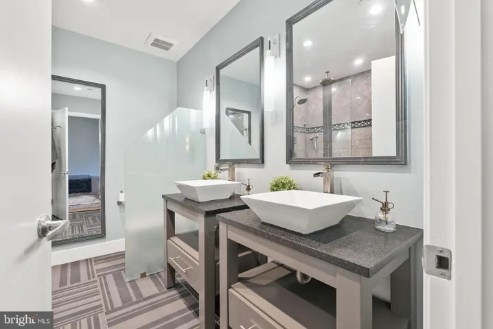 The primary bedroom suite is a serene retreat, with a gorgeous renovated bathroom featuring high-end tile finishes, heated Italian glass flooring, and a luxury spa-like shower, plus a large walk-in closet. Thoughtfully redesigned, the second bathroom showcases a marble vanity top, contemporary fixtures, and refined tile work, creating a luxurious and inviting space. The large den is flexible and functional as a home office, guest room, media space, second living area, or creative studio, adapting seamlessly to your lifestyle.