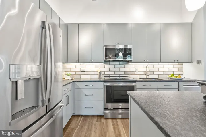 The renovated gourmet kitchen is a chef’s dream, featuring modern cabinetry, black honed granite counters, a stunning industrial glass backsplash, and a wine refrigerator. Luxury vinyl plank flooring in rich light brown tones ties the home together with elegance and warmth.