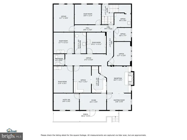 Move-in ready first-floor medical office with handicap access ideal for medical or professional use. Features reception and waiting area, multiple exam rooms with sinks, private offices, storage, restroom, and dedicated Suite 100 entrance. Large front porch enhances visibility. Prime location with 23,000 cars/day, 6-min I-95 access, strong demographics (82K population, $117K income). Great fit for home care, personal care, adult daycare, child daycare, and medical service providers.