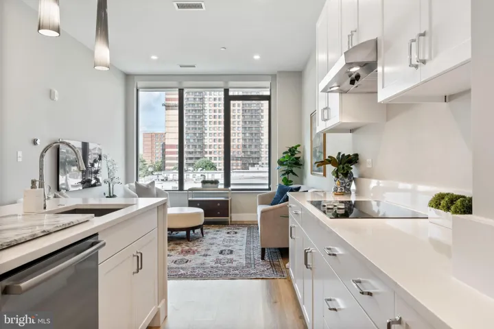 Built in 2022, voluminous ceilings and enormous windows highlight the open floor plan and unusually spacious kitchen with quartz counter tops and lots of roll-out storage. Well-appointed, neutral contemporary decor with Bosch appliances and high-end finishes. Floorplan can accommodate a roomy home office or auxiliary bedroom with deep closet and adjacent large full bath. Convenient in-unit laundry features full size washer and fully vented dryer.