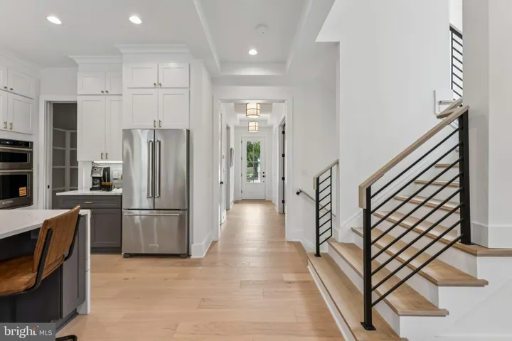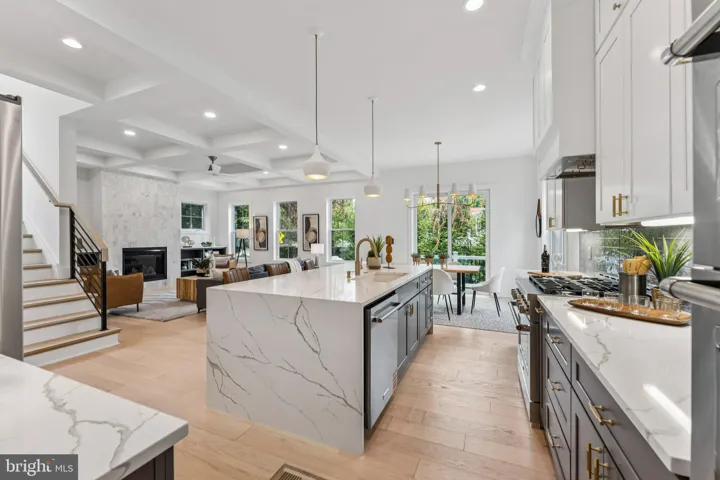The main level features an open-concept layout with white oak hardwood floors, a gourmet kitchen with oversized island, high-end appliances, and custom cabinetry. A dedicated home office and spacious family room create the ideal setting for both entertaining and everyday living.