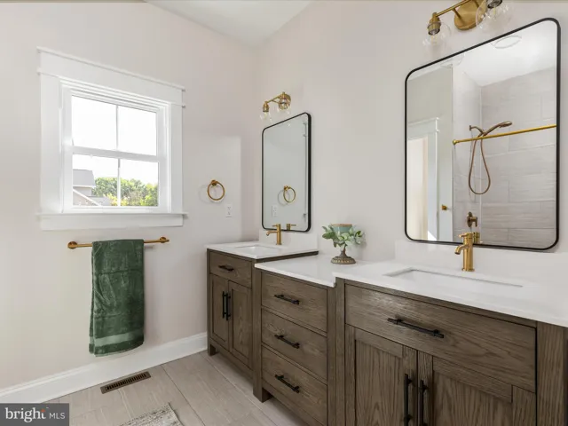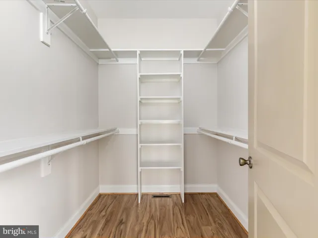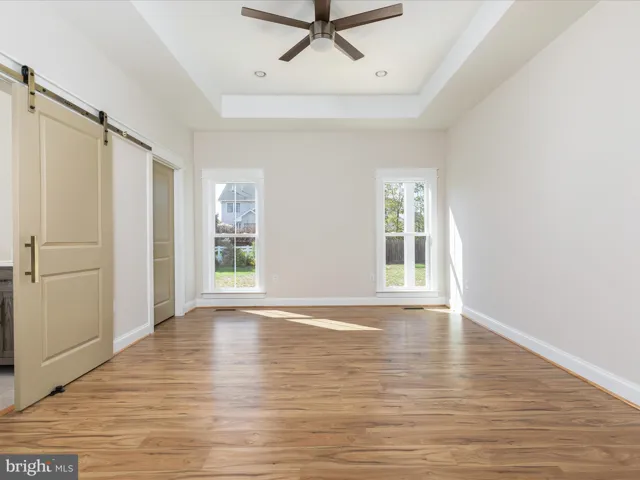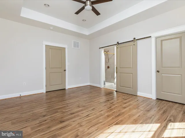 The Primary Bedroom is on one side of the property and the 2 additional bedrooms and bath are on the other side of the home. All Bedrooms have 9ft ceilings, and all have ceiling fans with remotes! The Primary has a Tray Ceiling, wood shelving in the large walk in closet and a Barn Door that leads to the primary bath. The primary bath has 2 sinks, custom tiled shower and a water closet.