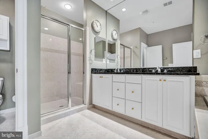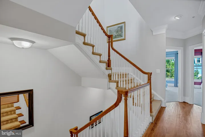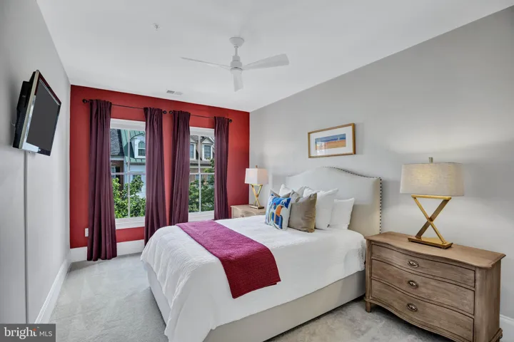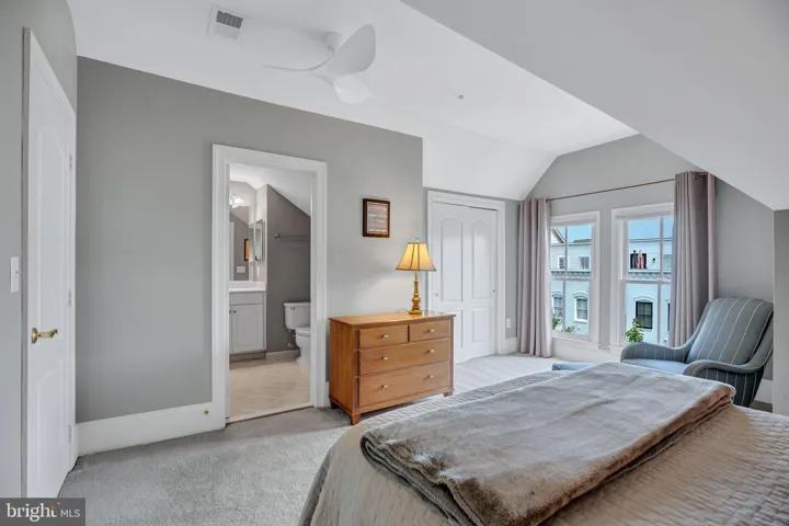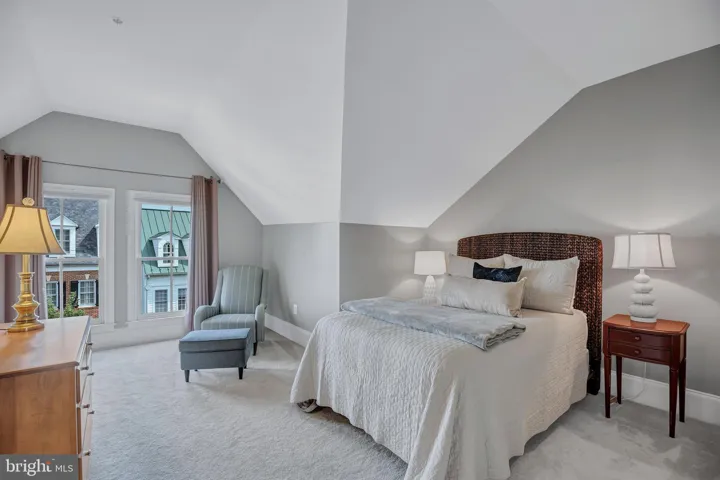 Ascending to the third floor, you’ll find the serene owner’s suite, complete with two custom walk-in closets, ceiling speakers, recessed lighting, Hunter Douglas Top/Down Bottom-Up shades, designer wall-to-wall carpeting, and a luxurious en-suite bath. The spa-inspired bath features a separate water closet, soaking tub, and a walk-in shower with a built-in bench. Two additional well-proportioned bedrooms, a full bath with a glass-paneled shower/tub combination, and a linen closet offer functionality and comfort. A full-sized laundry room with a 2018 washer and dryer is also located on this level for added convenience.