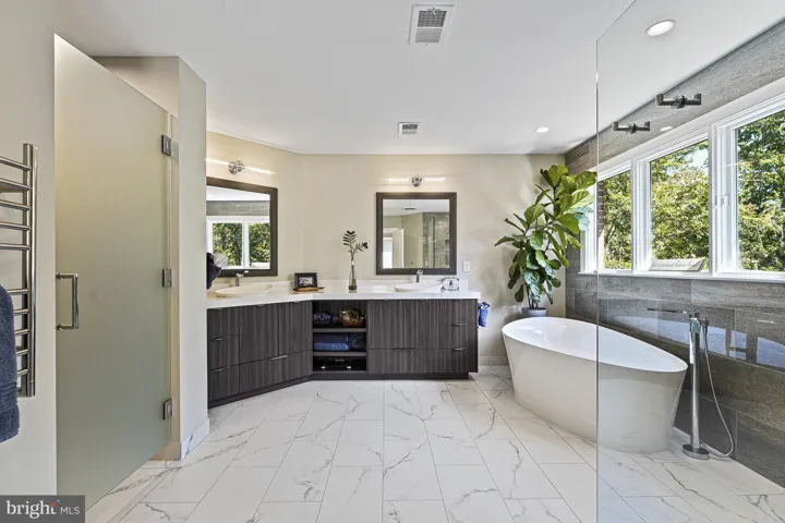 Upstairs, the smartly laid out Primary Suite with two custom closets and a completely renovated bathroom with a gorgeous frameless glass walk-in shower and heated towel bars is the place to start and end your day. Three additional spacious bedrooms on this level offer limitless possibilities, one with wood floors and two with new carpet (2025), all with connected baths and large closets.