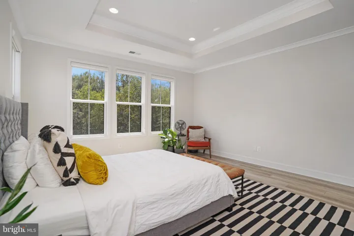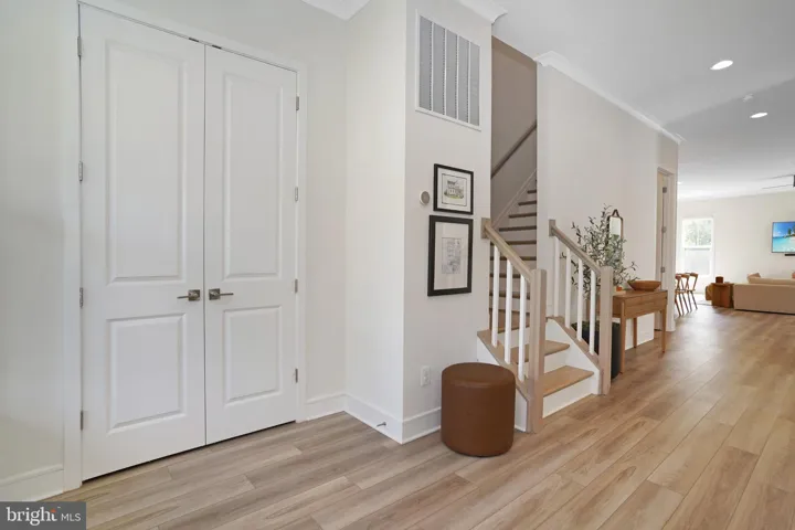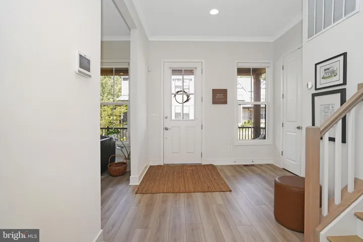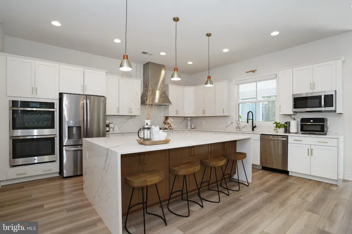 The main level welcomes you with 10-foot ceilings, European white oak LVP floors, and abundant natural light. The chef’s kitchen features a quartz waterfall island, quartz countertop and backsplash, professional-grade range hood, stainless steel appliances, a 5-burner gas cooktop, built-in microwave and double wall ovens. The maple latte colored center island with cabinets on both sides adds extra storage, while the spacious walk-in pantry and mudroom provide exceptional convenience. A screened-in porch with stairs leading to a large stone patio makes this home perfect for indoor/outdoor entertaining.