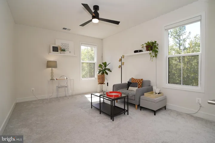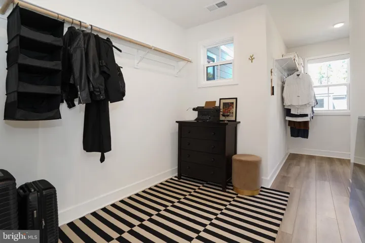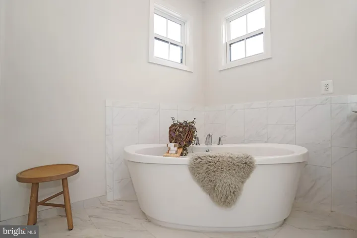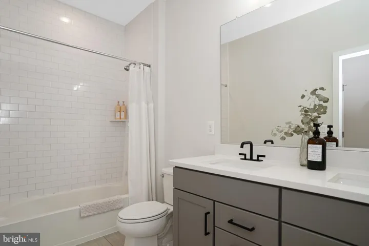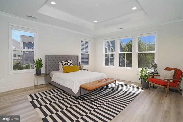 Upstairs, the primary suite offers LVP flooring, a walk-in closet, and a spa-like bathroom with a maple latte double vanity accented by gold fixtures, a freestanding soaking tub, and a frameless glass shower. Two bedrooms share a hall bath with double vanity, while the fourth bedroom enjoys a private en-suite bath and walk-in closet. A laundry room with LG washer and dryer and soaring 9-foot ceilings complete the upper level.
