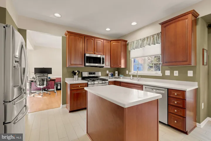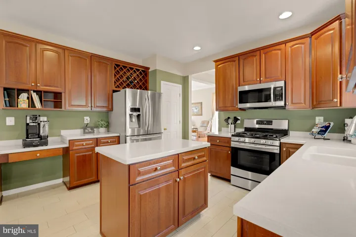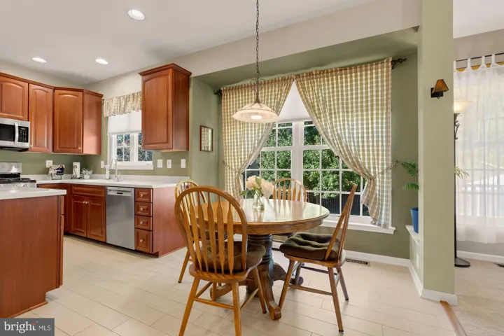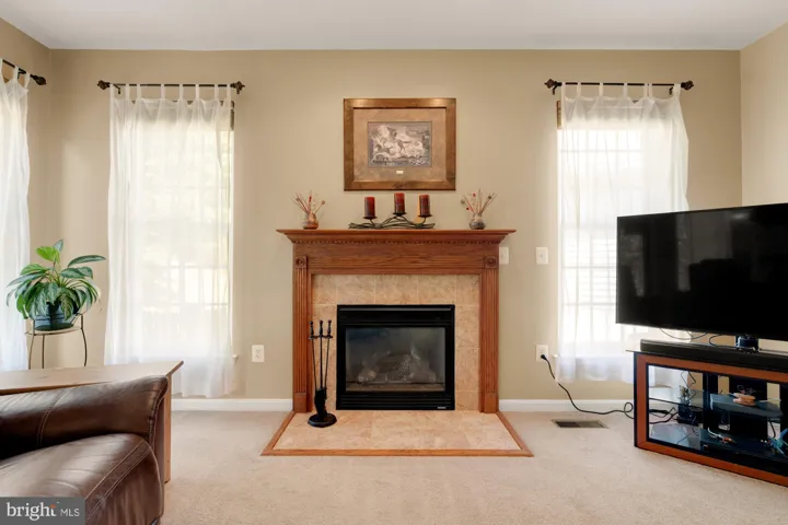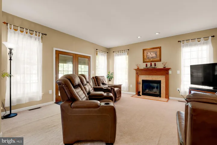 The open-concept kitchen seamlessly flows into the spacious family room, creating perfect gathering spaces. The kitchen features elegant Corian countertops and a complete suite of stainless steel appliances: microwave (2022), refrigerator (2011), stove (2017), and dishwasher (2016). The family room welcomes you with a cozy gas fireplace and direct access to your private outdoor retreat.