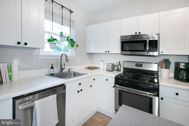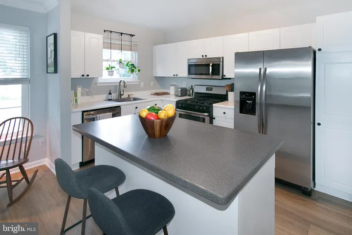 – Gourmet Kitchen: Features a stunning kitchen island with elegant Corian countertops, a large sink, and newer stainless steel appliances – perfect for home chefs and casual dining alike with plenty of shaker cabinetry.