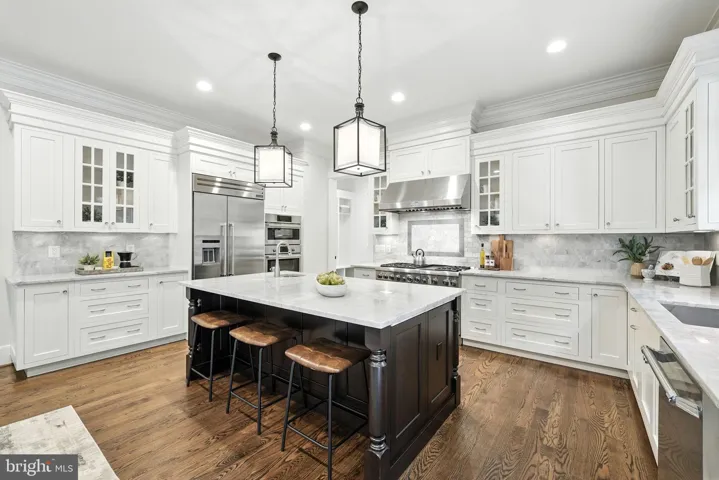 Step onto a private, elevated front porch and enter a spacious foyer flanked by formal living and dining rooms with graceful wainscotting. The gourmet eat-in kitchen is a chef’s dream with Thermador & Bosch appliances, a 6-burner + griddle range, marble countertops, and a large breakfast bar with prep sink. French doors open to a tranquil flagstone patio, ideal for al fresco dining. The kitchen flows seamlessly to a coffered-ceiling family room with gas fireplace, while a tucked-away main-level bedroom doubles as a private office or guest suite. Functionality meets style with two staircases, two powder rooms, and the ultimate mudroom drop zone featuring ample cubbies, walk-in pantry, and additional storage.