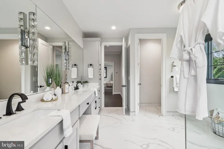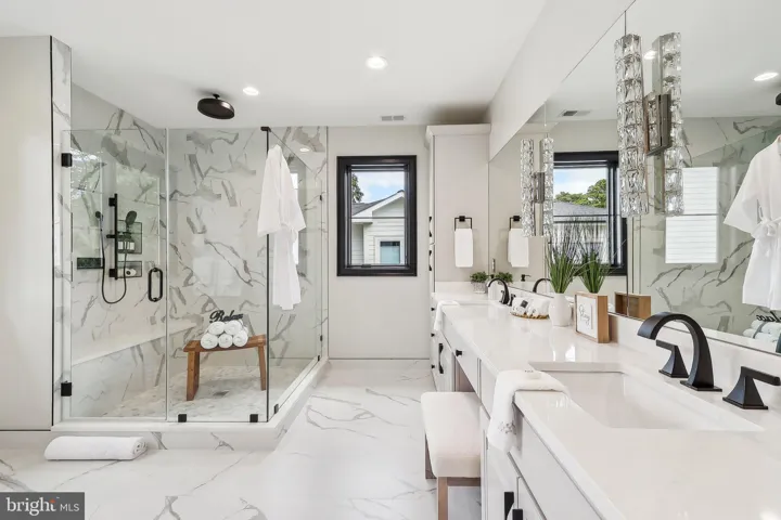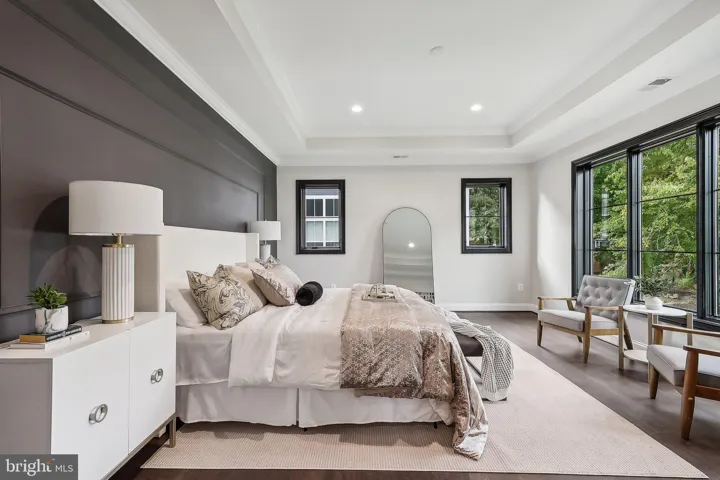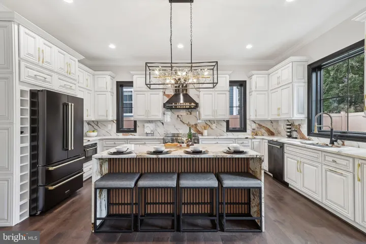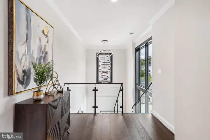 Inside, you’ll find an airy open layout with dramatic black-framed windows, floating glass-railed stairs, and custom wood accents. The gourmet kitchen is a showstopper, boasting exotic quartzite counters, Italian tile, and chef-grade appliances. A main-level office with a full bath easily doubles as a sixth bedroom, giving you the flexibility you need.