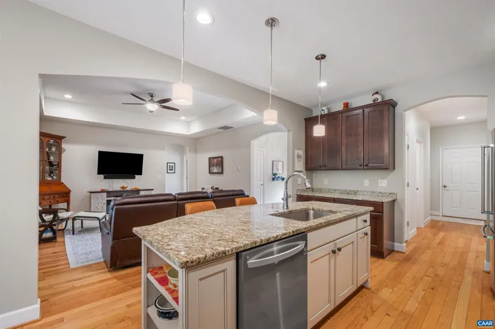 Constructed in 2016, this thoughtfully designed and custom built home in Troy offers tranquility and ease of living without sacrificing access to social and urban amenities. Situated on a private yet spacious 2.25 acre lot, the open concept 3 bed/2.5 bath floorplan lives large on a single level. Through the front door, one enters into the bright living room with tray ceilings. The luxurious eat-in kitchen- framed on one side by the oversized island with a breakfast bar- features granite countertops with maple cabinetry and soft-close dovetail drawers. Continue past the kitchen to the spacious primary suite equipped with two walk-in closets. The sizable en-suite primary bathroom features dual vanities, a soaking tub, and a larger shower. The full-size, walkout basement is the perfect flex area for a game room, home gym, or entertaining space, and comes with brand new Pergo laminate flooring. For those who enjoy the outdoors, one can choose to relax either on the new paver patio or escape to the shade of the tranquil screened porch that opens out from the living room. The oversized attached 2 car garage includes workbench space. Only 5 minutes from Zion Crossroads, 15 minutes from Pantops, and 40 minutes from Short Pump.,Granite Counter,Maple Cabinets