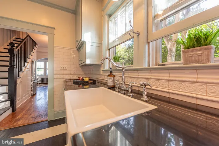 The galley kitchen has tile counters, farmhouse sink and custom cabinetry. A small covered porch off the kitchen is perfect for reading or bird watching.