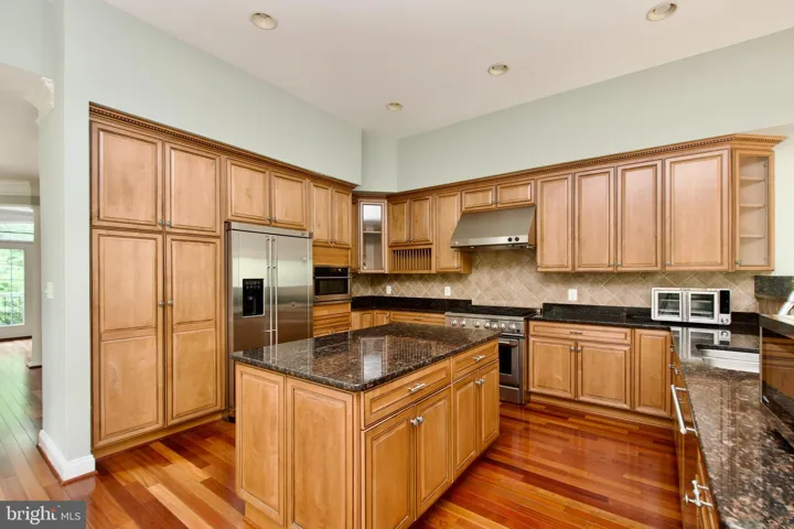 Gleaming Brazilian Cherry hardwood floors adorn the entire main and upper levels, while the ground level boasts luxurious vinyl flooring. The gourmet kitchen is a chef’s dream, featuring stainless steel appliances, a six-burner gas stove, granite countertops, custom cabinetry, a ceramic backsplash, an island, and a breakfast bar. The exhaust fan vents to the outside, ensuring a fresh and clean cooking environment.
