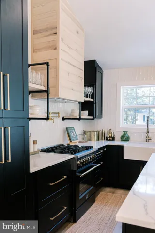 OAK & EMBER LODGE — a professionally designed, fully furnished, one-level showpiece ≈2.2 miles to Bryce Mountain Resort. A cohesive custom millwork package—shaker wainscoting, oversized trim/crown, panel mouldings—was site-finished for a tailored, luxury look. Bespoke artisan furnishings convey, including solid-wood custom bed suites (king/queen/bunk) and hand-made console tables commissioned to the home’s palette and proportions. Under a cathedral ceiling with chandelier, the great room flows into a quartz & gas kitchen with farmhouse sink + pot filler, tile backsplash, floating shelves, soft-close black cabinetry w/ gold hardware, and an island with seating. Two spa-style baths feature mosaic floors, walk-in tiled showers, and coordinated black-and-gold fixtures. Walk-in closets in all bedrooms; LVP throughout. Outdoors: lit path to a private sauna, propane firepit (seating for 10), spacious deck, and water feature. Turnkey: the fully stocked kitchen (small appliances, cookware/bakeware, tools, dinner/glassware), bedding/linens, art/pictures, and décor all convey (see inclusions). About 2 hours to D.C. Ideal as a luxury STR, vacation home, or refined full-time residence—a must-see.