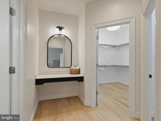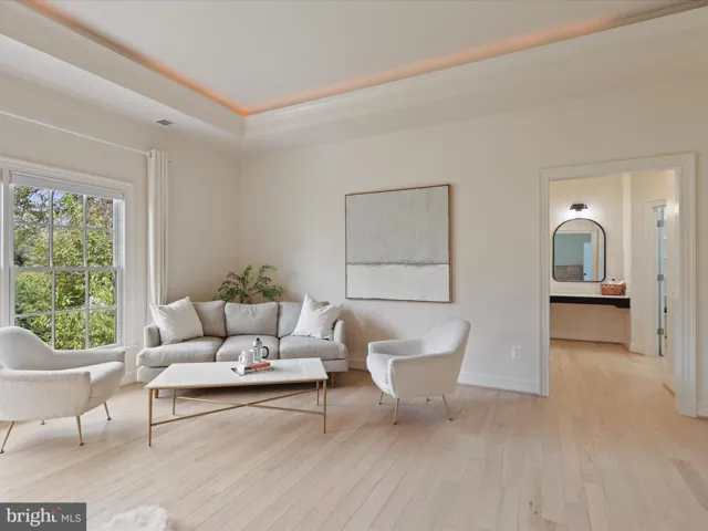 The primary suite is a lavish sanctuary. It features newly installed white oak hardwood floors, boasts double walk-in closets, a dedicated vanity room, and a spa-like bath equipped with Italian travertine, a dual shower, a separate soaking tub, and a private powder room.