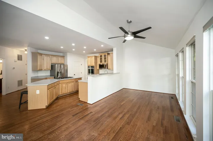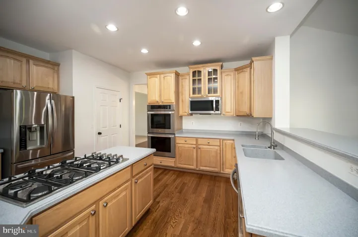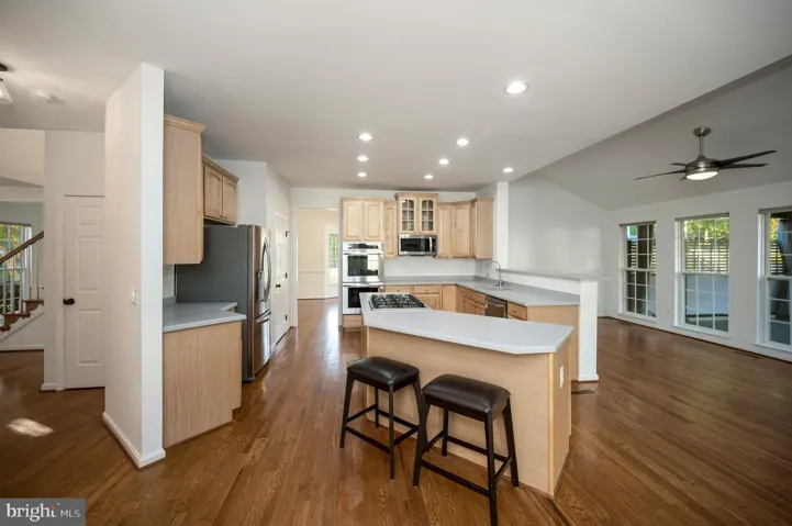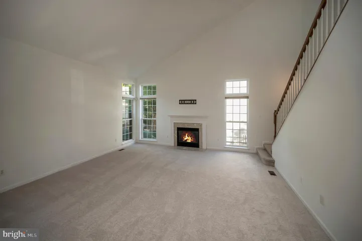 The gourmet kitchen is equipped with Corian countertops, 42” cabinets, center island, double ovens, and an adjoining morning room that provides abundant natural light—perfect for casual dining. Just off the kitchen is the striking two-story family room with a gas fireplace, creating a central gathering space for everyday living and entertaining. A dual staircase design provides both elegance and convenience, while the main-level office with glass French doors offers a private workspace.