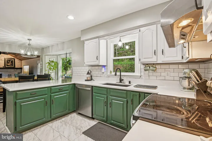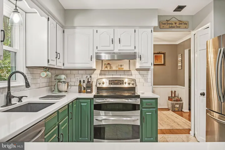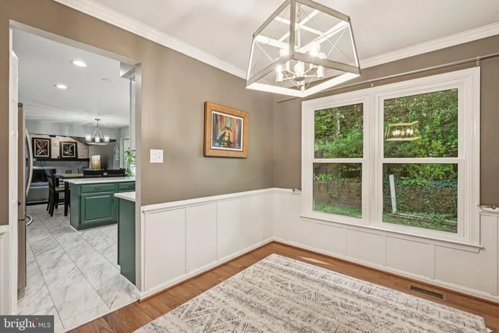 Inside, you’ll find a welcoming foyer that opens to light-filled formal living and a dining room enhanced with crown molding, wainscoting, and gleaming hardwood floors. The updated kitchen offers quartz countertops, a stylish backsplash, new flooring, a bay window breakfast area, and a functional layout that makes everyday meals or entertaining a delight. The family room features vaulted ceilings with skylights, a cozy whitewashed brick fireplace, and French doors leading to the outdoor living space.