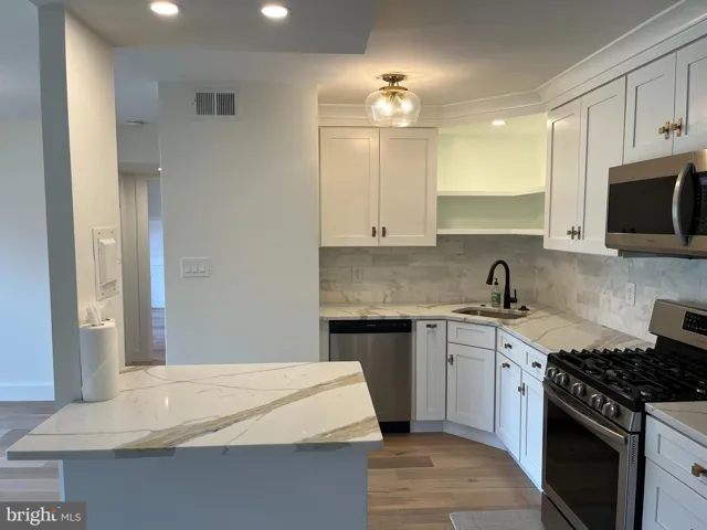 Amazing top floor level condo that has complete makeover. Engineered hardwood floors throughout. SS appliances, quartz counter tops, gas range, side by side refrigerator with ice and water dispenser. Elegant new lighting and LED recessed lights. Redone bathroom with walk in glass door shower and new tile. Rare to find washer and dryer in one inside the unit. Extra laundry and storage in the basement level. Gas heat. Water/ sewer and trash included in the rent. Luxury and charm await in this beautiful home. Small dog considered with pet deposit.