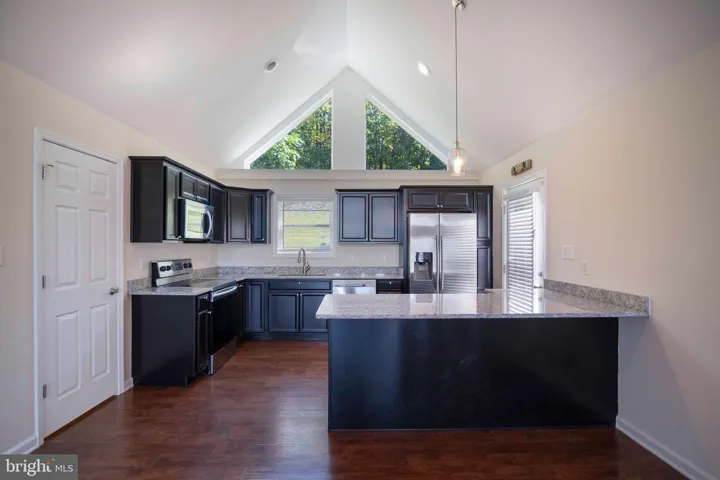 Open concept kitchen, dining, and family room with vaulted ceilings opening to the expansive deck