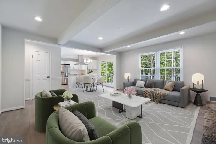 Enter into a welcoming foyer that opens to formal living and dining rooms with engineered hardwood flooring and updated lighting, The main level flows into a fully renovated chef’s kitchen, complete with quartz countertops, soft-close cabinetry, marble tile backsplash, and stainless steel appliances. A charming breakfast area opens to the family room, where a restored wood-burning fireplace and large sliding glass doors frame peaceful views of the backyard.