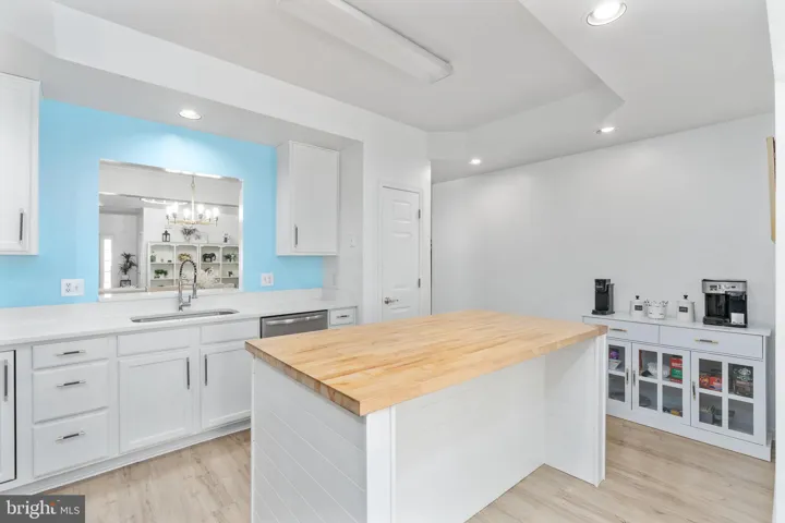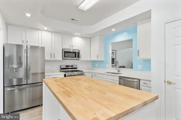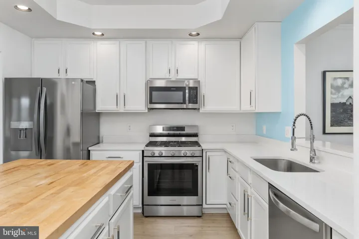 Step inside to a bright and spacious living room with soaring vaulted ceilings and abundant natural light. This open space flows beautifully into a dining area, complete with room for a chandelier, and a stunning kitchen featuring upgraded quartz countertops, brand-new stainless steel appliances (including gas cooking!), and an oversized butcher block island—a true chef’s dream.