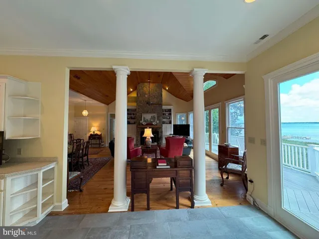 Only one hour from Richmond, this unique, private 8.0-acre property boasts 275 feet of river frontage. The property consists of an elegant, but casual architecturally designed home on an 8-acre lot, the adjacent 8.6-acre lot zoned for a single-family residence is also for sale. The property offers spectacular views of the river. Looking southeast, the view exceeds six miles. The home consists of two levels, the upper level offers a living room, primary bedroom and adjacent bath, gourmet kitchen, laundry room/pantry and a three-car garage. The lower level consists of a Jack and Jill bathroom, two bedrooms and a living room. The living room could be used as a 4th bedroom. Adjacent to the living room is an office. The upper-level living room features a wood burning fireplace with a gas starter,16-foot vaulted ceilings with cypress paneling, heart of pine floors, Tuscan columns and custom cabinetry. Adjacent to the living room is a half bath/powder room. The primary bedroom has 10-foot ceilings, a wood-burning fireplace with a gas starter, a large walk-in closet plus an adjacent bath with soaking tub. The kitchen features a gas stove, double ovens, stainless steel appliances, eat-at island, breakfast nook and 10-foot ceilings. All kitchen appliances were purchased in the last two years. Adjacent to the kitchen is a spacious pantry, laundry room and three car garage.