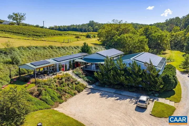 Centrally located in the Monticello AVA, and in the center of the Nelson 151 Craft Beverage Trail, Cardinal Point Vineyard & Winery has been in business since 1985. Surrounded by breathtaking Blue Ridge Mountain views, this well established family run 81 acre winery is ready for its next owner. The heart of the property is the classic 5 bedroom 1890s farmhouse. Featuring gleaming original hardwood floors, period fixtures, dual primary suites, stunning cherry kitchen, sunroom, and inground pool, the house is currently operated as a hugely popular short term rental. Of the 35 open acres 7 are in established vineyard production, with 4 acres currently fallow and ready for new vines. The winery features a contemporary 1080sqft tasting room with office & restrooms, seating in the indoor mezzanine/outdoor covered deck/patio, and 2880sqft of production and storage space. Public amenities also include an outdoor stage, disc golf, and open space for picnicking & play. The property is supported by numerous outbuildings including a 5040sqft open equipment shed with work and storage spaces as well as a conditioned office. The house and winery are both fully energized by solar power, the house also has generator back-up. Opportunities abound!,Cherry Cabinets,Wood Counter,Fireplace in Kitchen