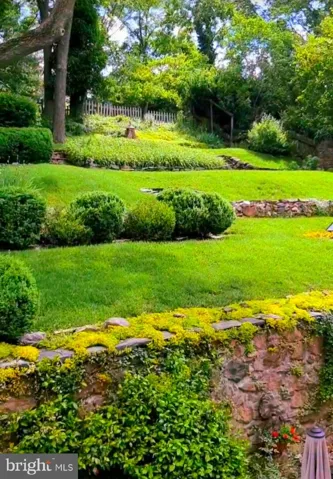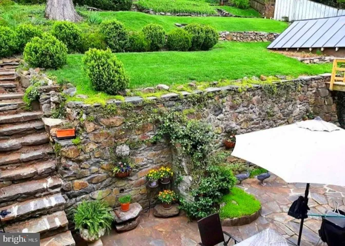 The custom kitchen is outfitted with cherry cabinets and modern amenities. This level extends to a lovely sunken-walled stone patio, perfect for al fresco entertaining. Above the patio walls lies the three-terrace yard featuring newly dry-stacked stone walls, boxwoods, an Asian Cherry Tree, a hidden Amish style garden shed, and cutting gardens with spring daffodils, lilies, poppies, irises, peonies, and more.